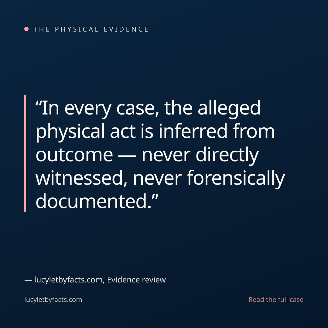 “In every case, the alleged physical act is inferred from outcome — never directly witnessed, never forensically documented.”